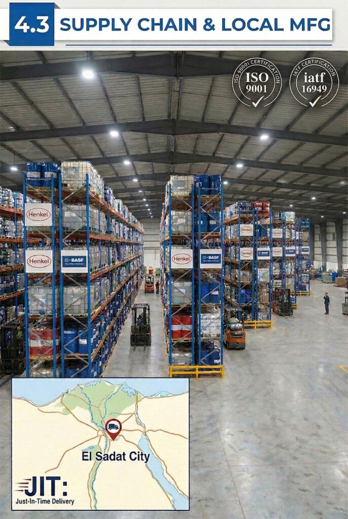 Availability is key. With our strategic location in Sadat City, we offer a massive competitive advantage in lead times and logistics. We apply Just-In-Time (JIT) delivery to reduce client inventory costs. Furthermore, we possess local manufacturing capabilities for high-quality solvents and auxiliary chemicals.